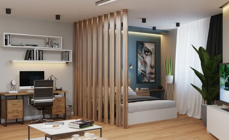 - Перегородки — от стационарных гипсокартонных конструкций до изящных раздвижных систем. В современных проектах я часто использую перегородки со вставками из матового стекла или деревянных реек: они пропускают свет, но создают необходимое ощущение уединения.